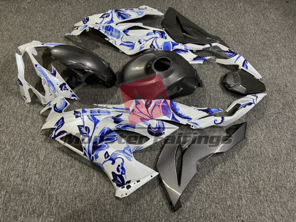 Kawasaki ZX6R 2019-2023 Gloss Pearl White Blue Flowers & Carbon Fiber ABS Fairings | Monster Fairings