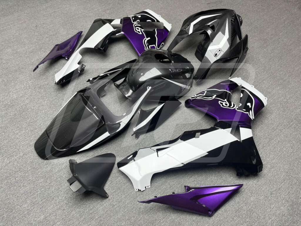 Discover the Honda CBR600RR 2005-2006 Gloss Carbon Fiber Style with Purple & White Bull ABS Fairings | Monster Fairings—your go-to upgrade for unmatched style, aerodynamics, and precision fitment. Perfect for sportsbike enthusiasts, these Honda CBR600RR Fairings refresh your ride with a vibrant, head-turning Gloss Carbon Fiber Style with Purple & White Bull finish, offering OEM-equivalent style and durability that's track-ready or street-smart.