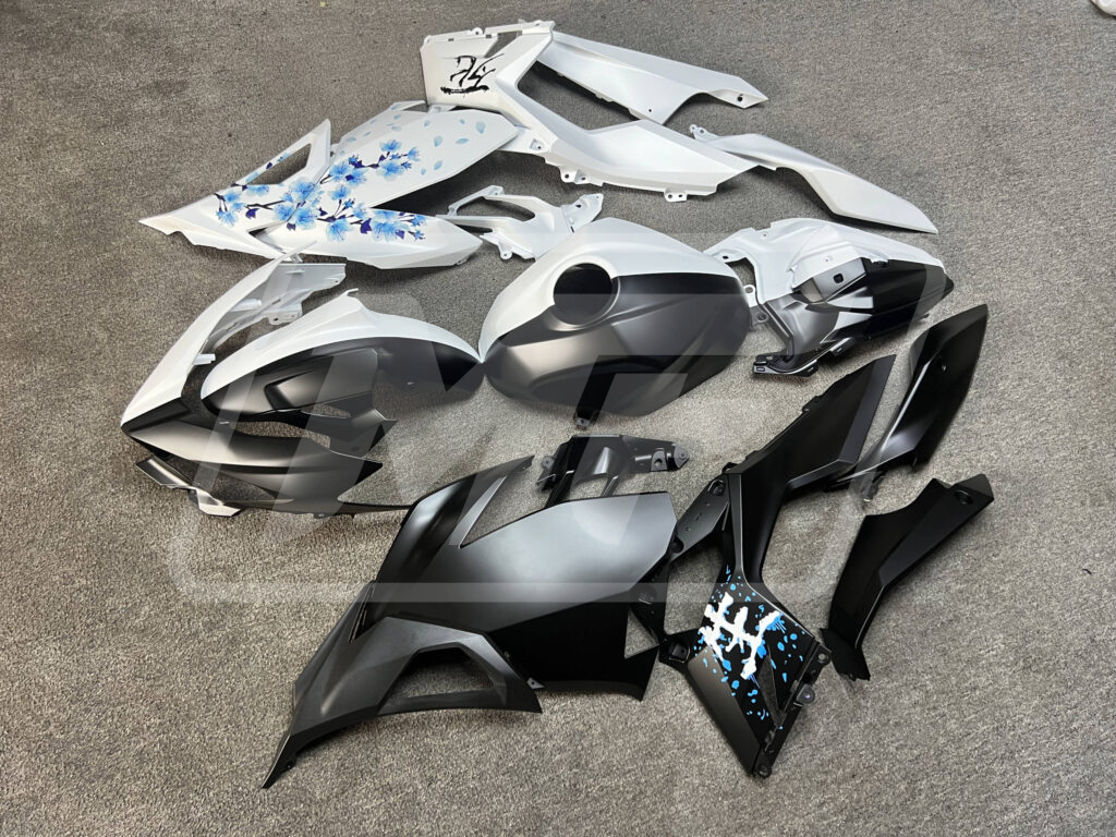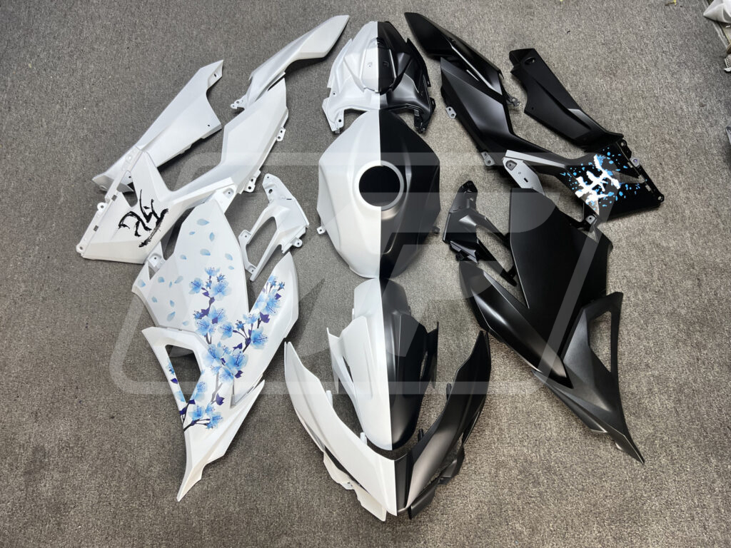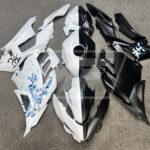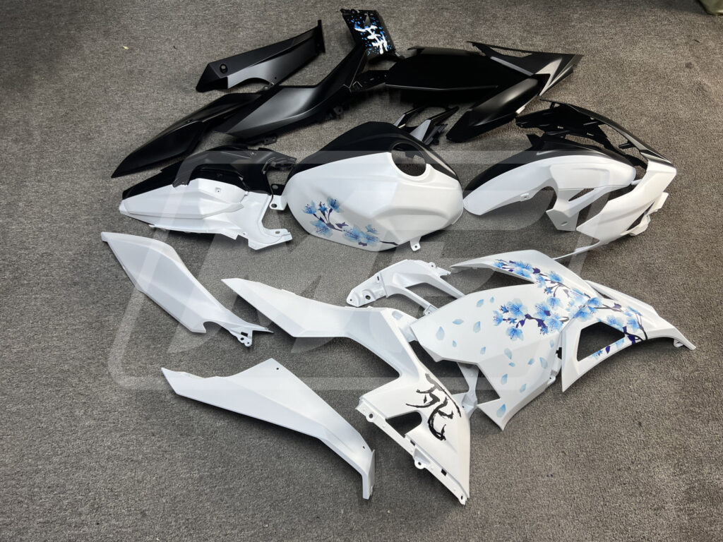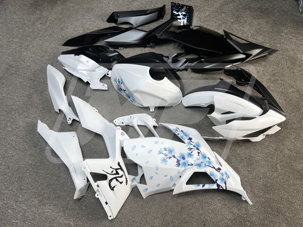 Kawasaki Ninja 400 2018-2024 Matte Black & White Blue Cherry Blossom Split ABS Fairings | Monster Fairings