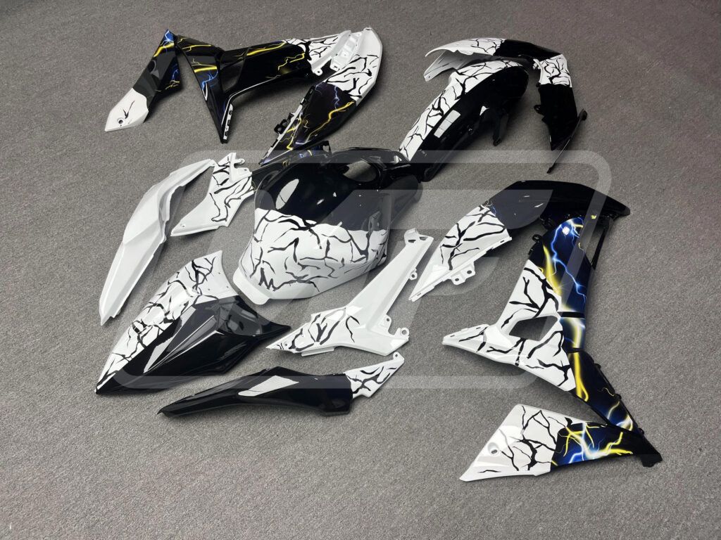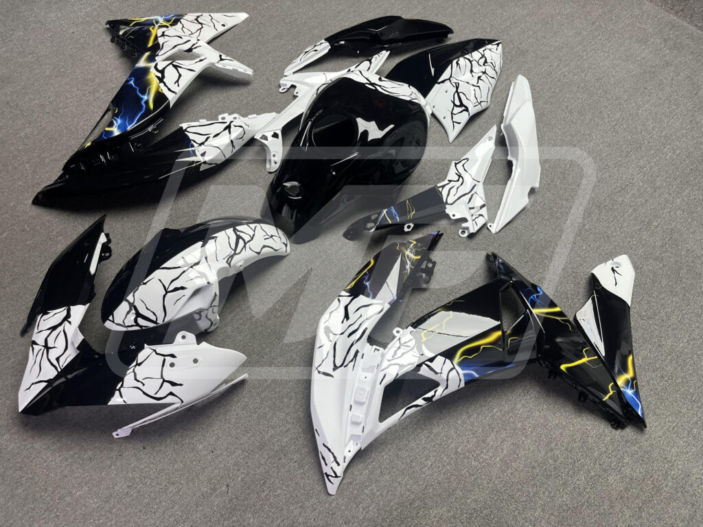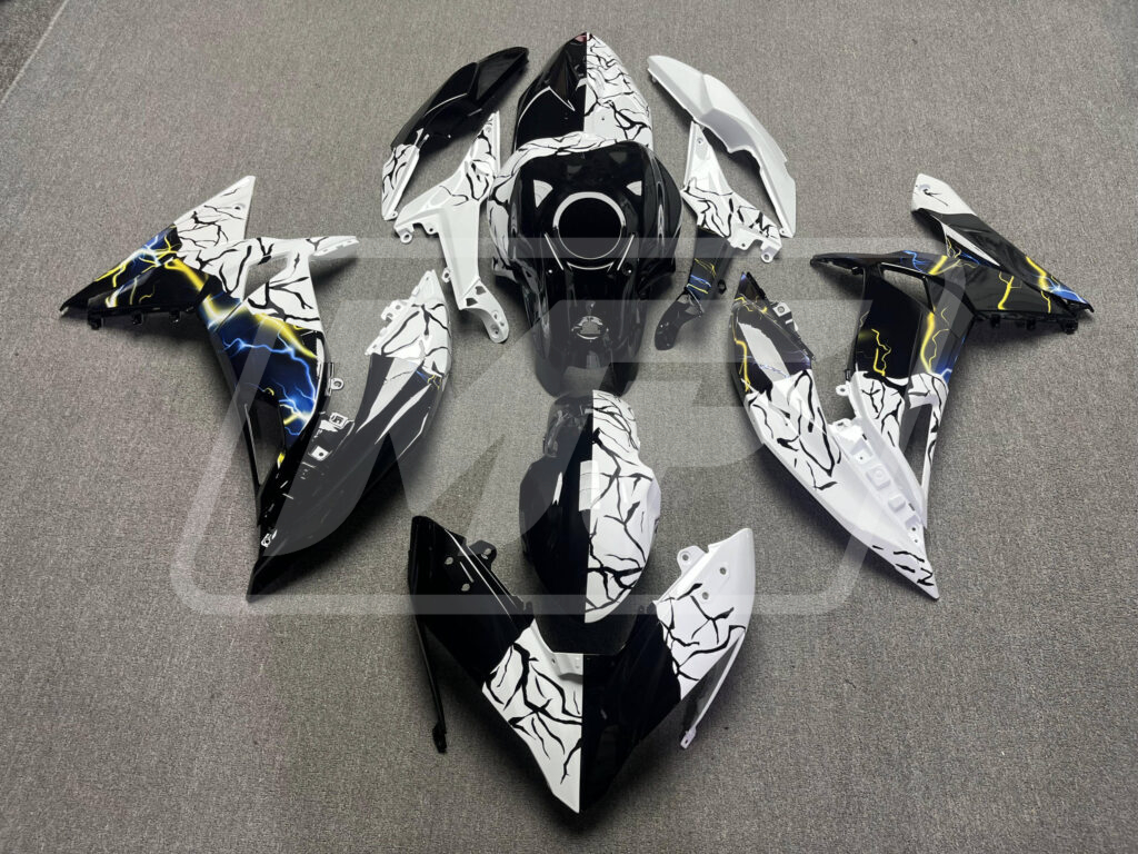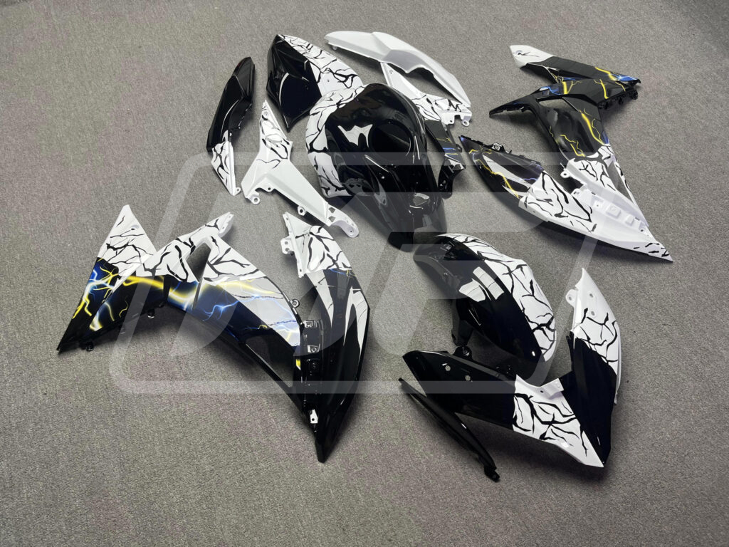 Kawasaki Ninja 650R 2017-2019 Gloss White & Black with Blue & Yellow Lightning ABS Fairings | Monster Fairings