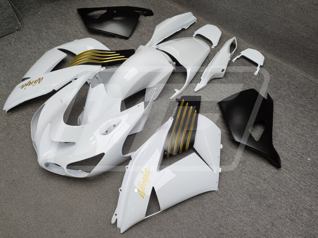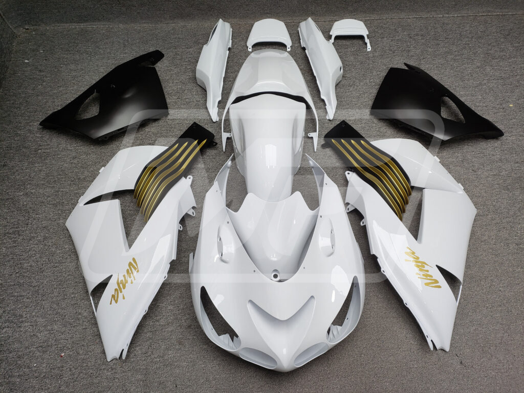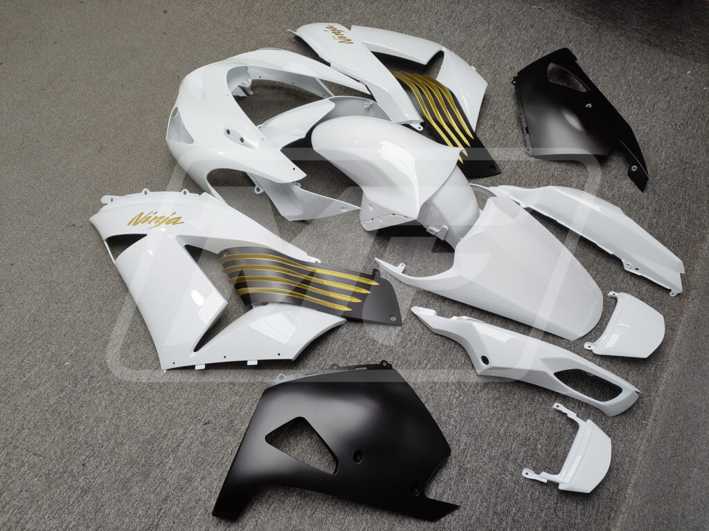 (IN STOCK TX) Kawasaki ZX14R 2006-2011 Gloss White & Matte Black with Gold ABS Fairings | Monster Fairings