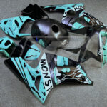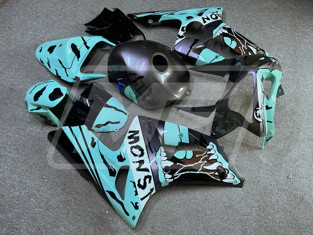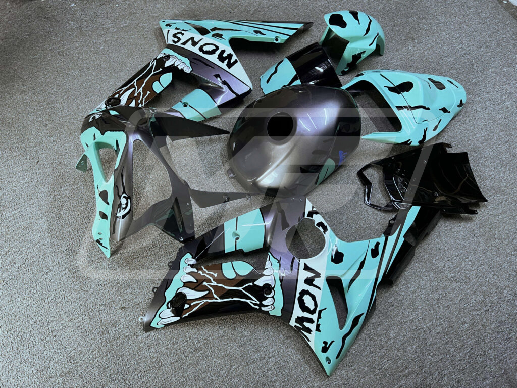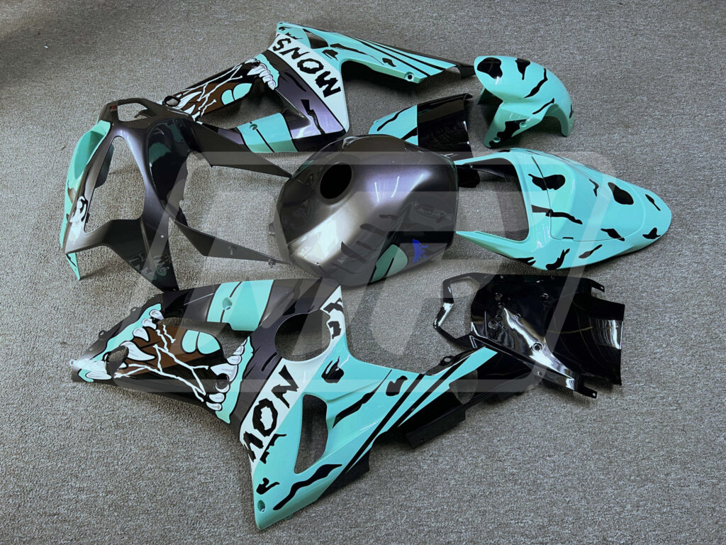 Discover the Kawasaki ZX6R 2003-2004 Gloss Gray & Teal Monster ABS Fairings | Monster Fairings—your go-to upgrade for unmatched style, aerodynamics, and precision fitment. Perfect for sportsbike enthusiasts, these Kawasaki ZX6R Fairings refresh your ride with a vibrant, head-turning Gloss Gray & Teal Monster finish, offering OEM-equivalent style and durability that's track-ready or street-smart.