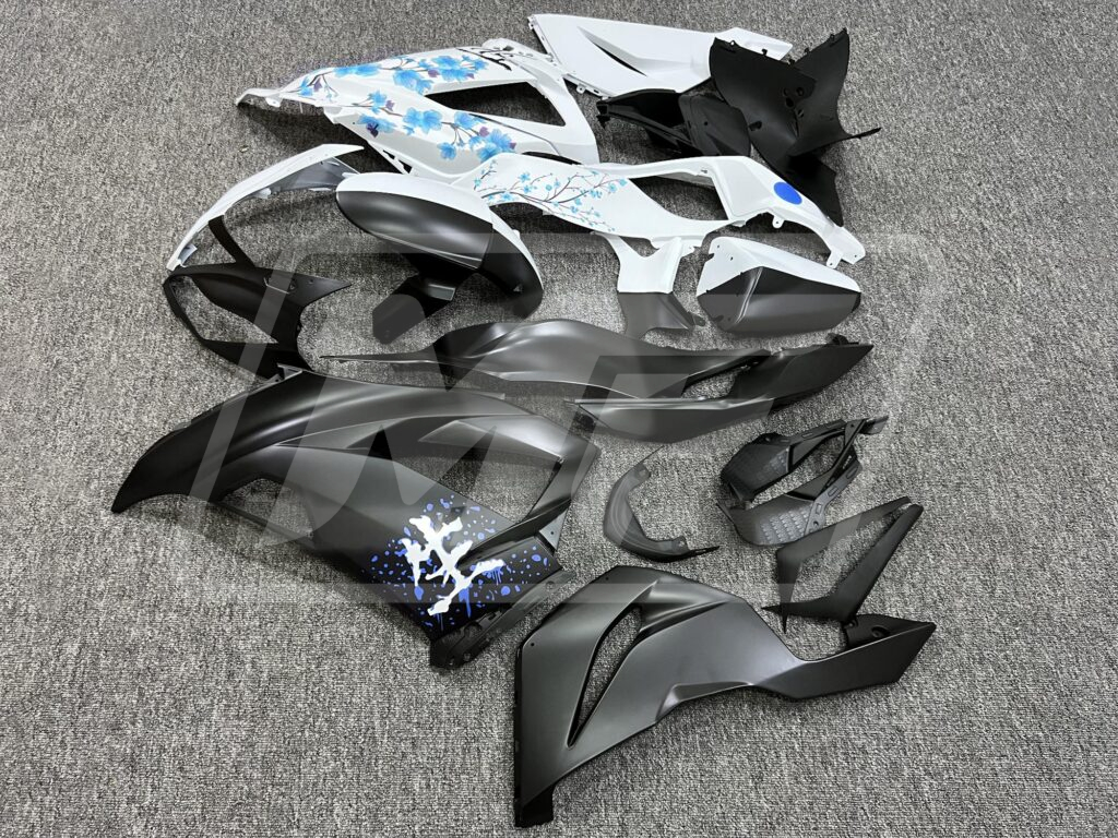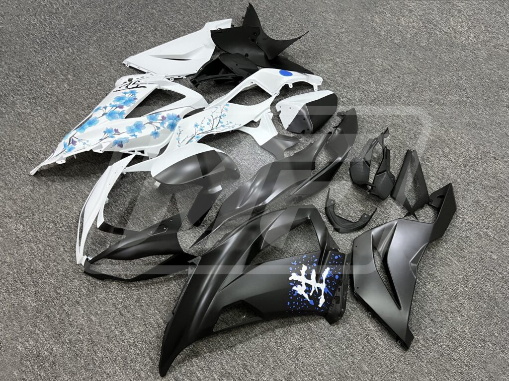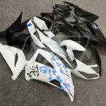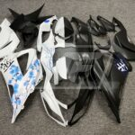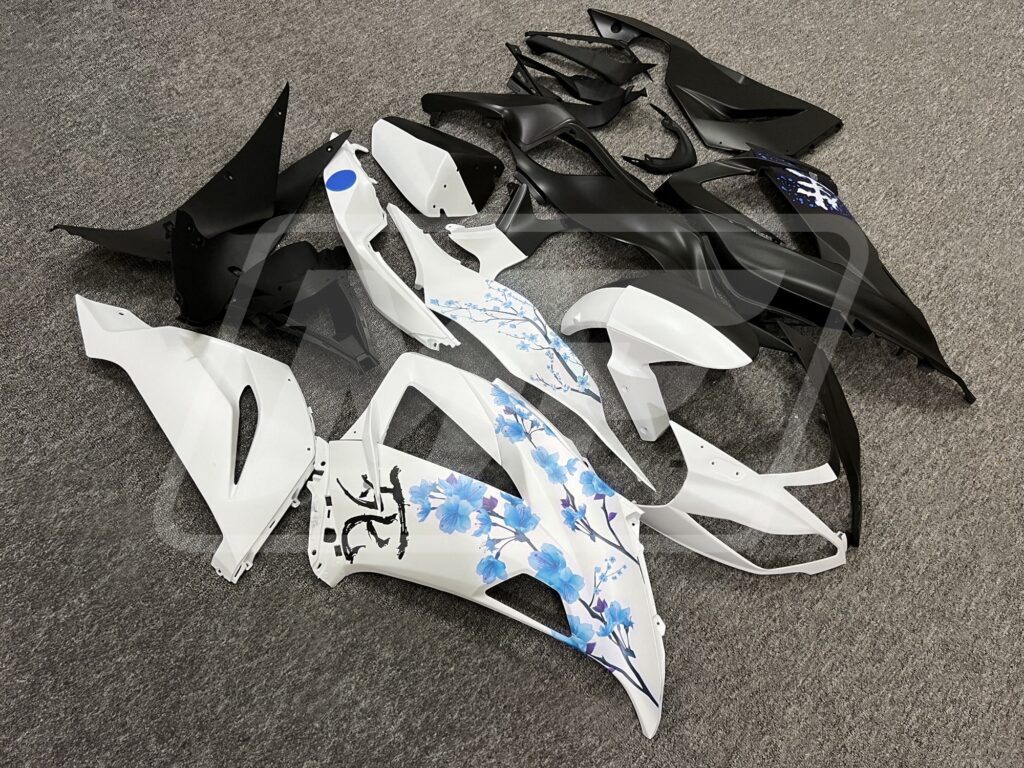 Kawasaki ZX6R 2013-2018 Matte Black & White Blue Cherry Blossom Split ABS Fairings | Monster Fairings
