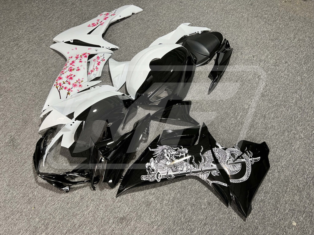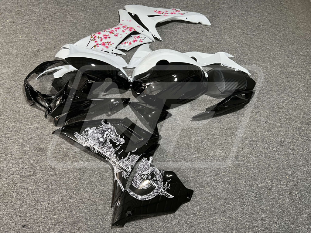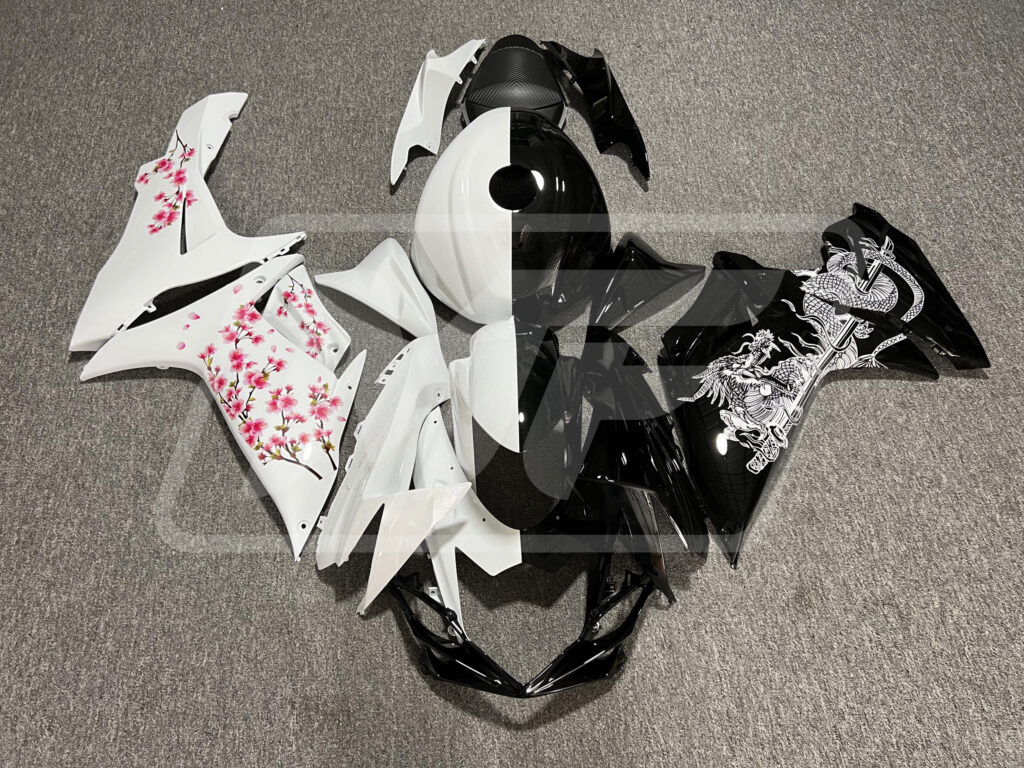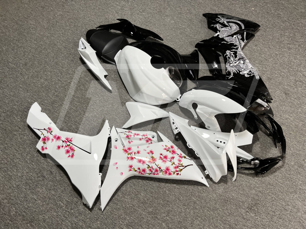 Suzuki GSXR 600-750 2011-2026 Gloss Black & White Cherry Blossom with Dragon Split ABS Fairings | Monster Fairings